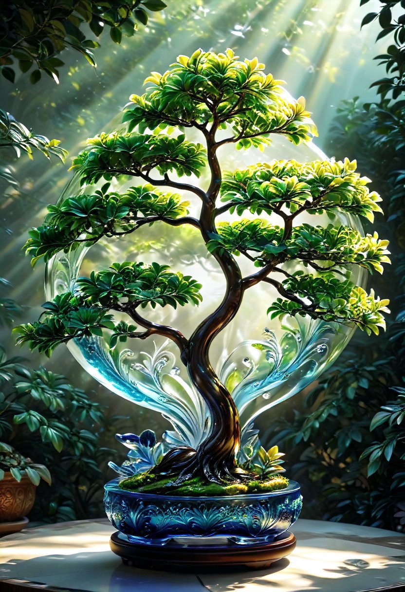 Bonsai tree made from glass, beautiful garden, dappled sunlight, 3D render, highly detailed, realistic textures, vibrant colors, tranquil atmosphere. masterpiece digital art, by artgerm and thomas kinkade, 8k resolution, cinematic lighting, digital, illustrative, double exposure, fantasy, beautiful, painterly, textural, artistic, aesthetic, intricate details, highly detailed, ultra-detailed, absurdres, vivid, vibrant, volumetric lighting, aid291, midjourneyv6.1, murano_glass_style