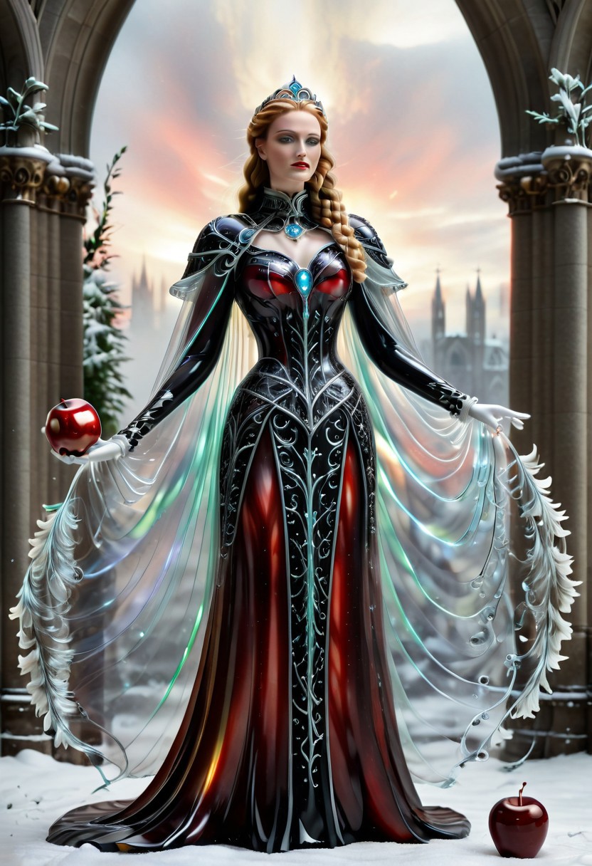 murano_glass_style, Realism_Quality_2xx_By_Stable_Yogi, (cathedral:2), indoors, standing, 1woman, solo, long hair, black choker, eyeliner, gorgeous lips, covered breasts, cinematic, best quality, ultra-detailed, very aesthetic, (natural eyes:1.4), freckles, aloof, (masterpiece:1.1), small waist, fitness body, wide hips, 32 years old, golden blond hair, censored, (big stained glass windows:1.4), (Victorian dress:2), high end closure, Evil Queen, cinemascope, moody, epic, gorgeous, film grain, (holding glowing red apple:2.4), (white ground fog:2), natural hands, blue elbow gloves, knee boots, dramatic , sunset, (orange sky:1.6), window, ritual magic, freyja, auburn hair, braided hair, magic, forest, Viking queen, mythic beauty, feathered cloak, fur, armor, robe, braid, rune jewelry, photorealistic, cinematic, flowers, jewelry, photorealism, cinematic lighting, high fantasy, mythic portraiture, soft background, northern folklore aesthetic, (fully dressed:2), trained,