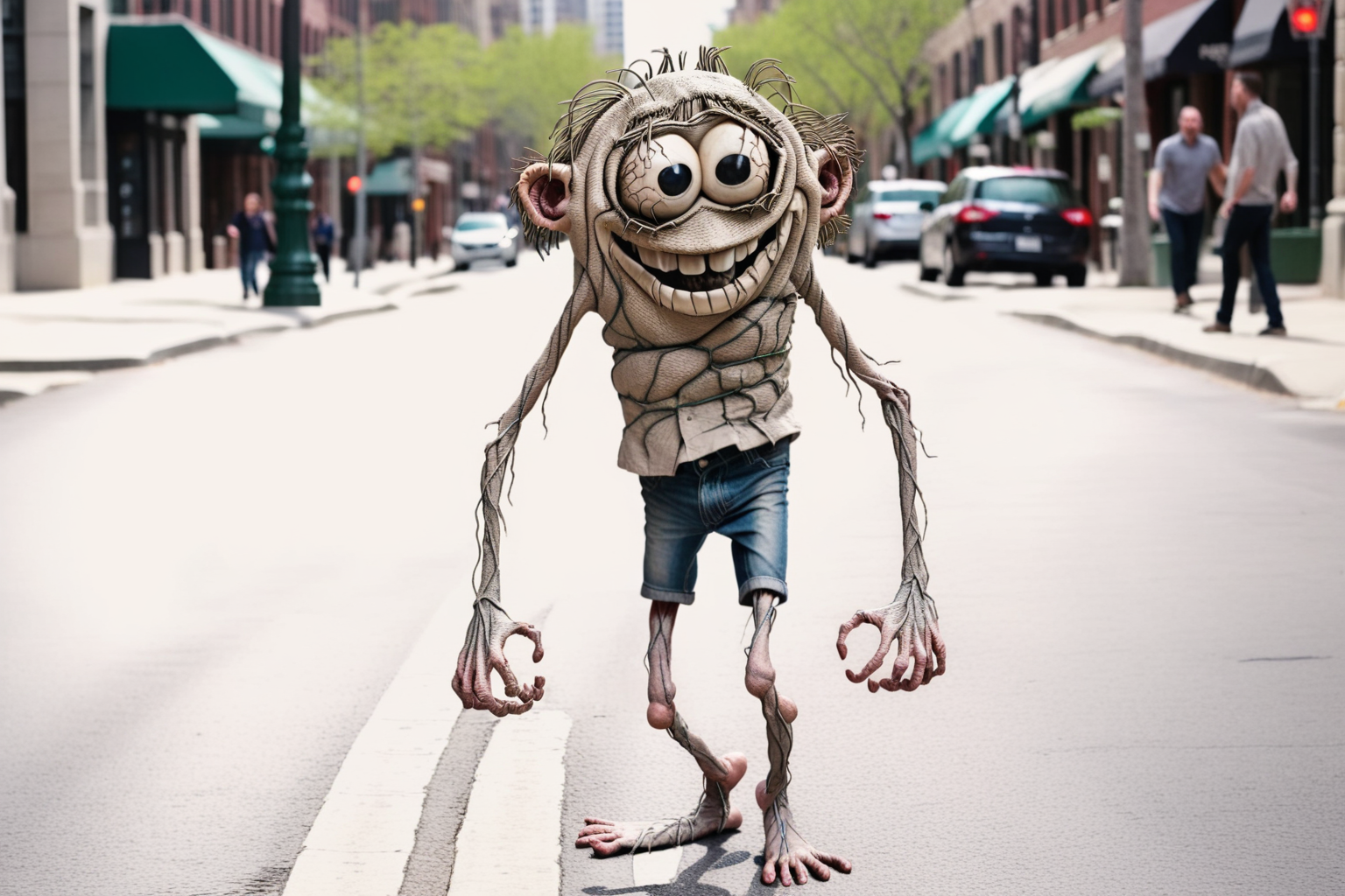 Hyperrealistic (Full body shot) photo Whimsical during in basilwolverton style, grotesque, spaghetti hair, bulging eyes, skin folds, veins, large teeth, bloodshot eyes 1man smiling walking down a city street looking across the street towards camera <lora:BasilWolvertonComboStyleXL_v1.1:0.8>
