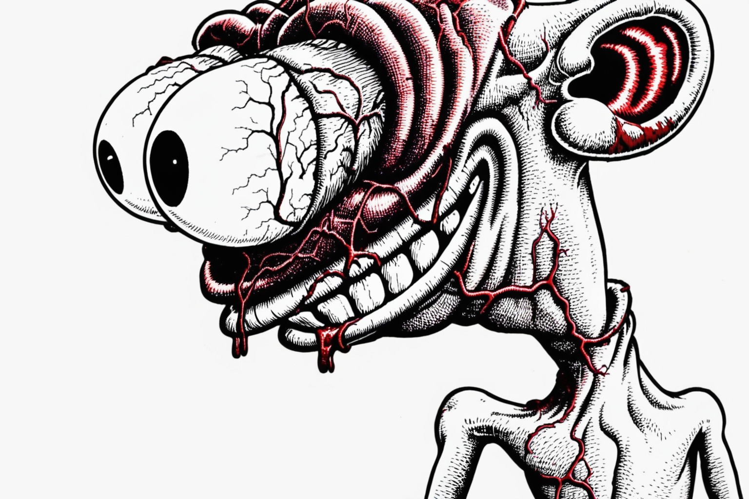 Full body focal point Whimsical during in basilwolverton style, grotesque, spaghetti hair, bulging eyes, skin folds, veins, large teeth, bloodshot eyes 1man looking over at camera <lora:BasilWolvertonComboStyleXL_v1.1:0.8>