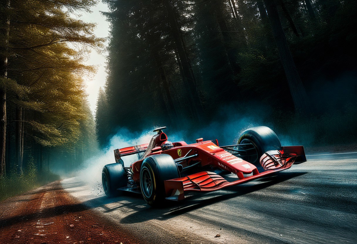 32k HDR Colorfull photorealistic , Ferrari red F1 car, digital painting, goo fast in dirty forest road, backgrund tree, Canon eos r3 , canon fish eye lens, masterpiece, award winning photo