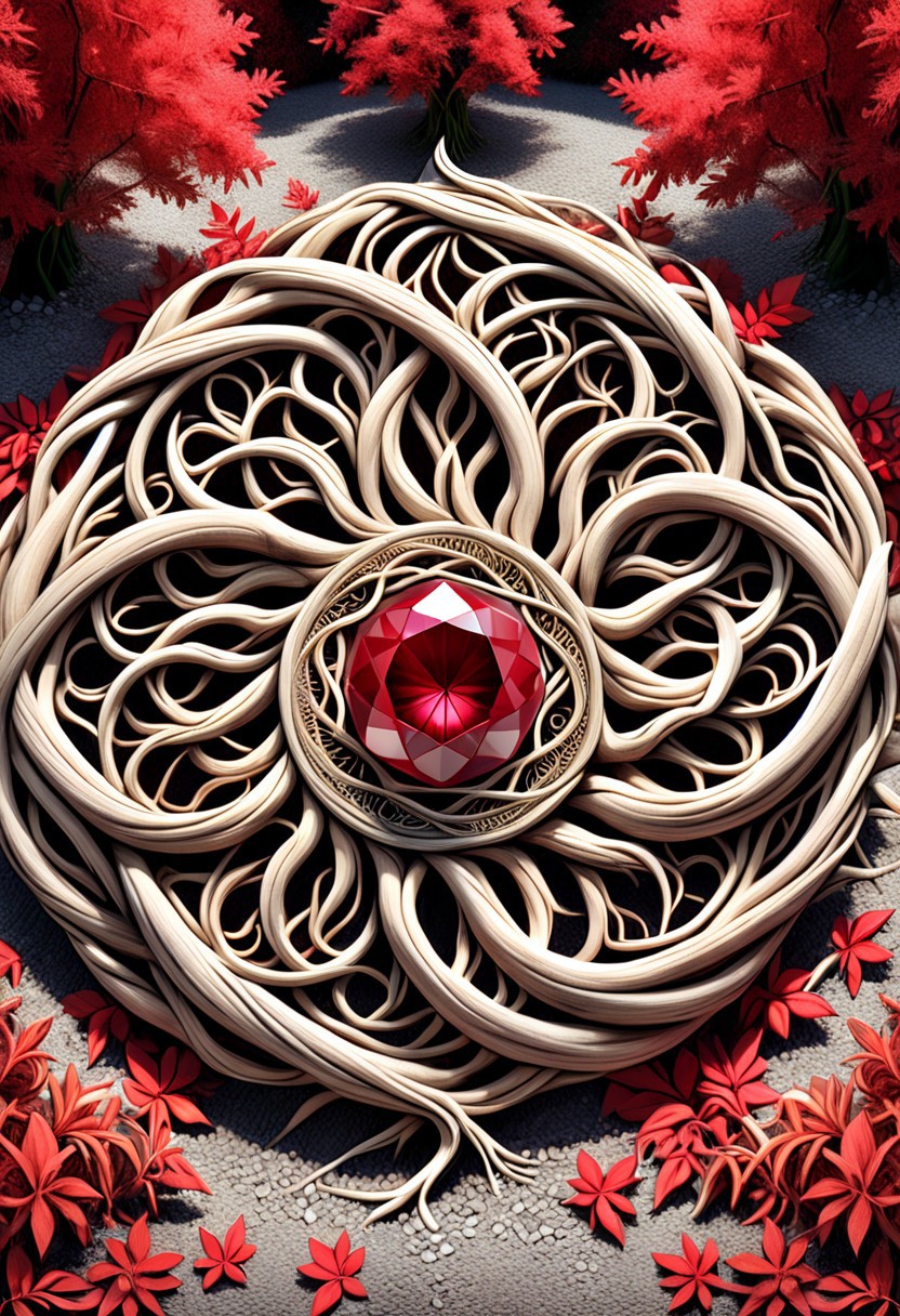 aesthetic, masterpiece, beautiful, elegant, award winning, absurdres, hdr, best quality, bloom, radiance from leafs, ruby gem at center, leafs, plants spread out from center ,PG-TR, symmetrical, geometric, 2.5d,