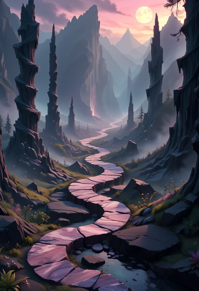 A breathtaking, hyperrealistic digital painting, a surreal, dreamlike landscape, rendered in a whimsical pastel color palette. The planet’s surface is intensely marbled bizarre pillars of stone , casting ethereal shadows across the scene. In the sky clouds drift over the bright and cheerful landscape, Below, a colorful, winding path constructed of polished, smooth crystal material spirals downwards towards the viewer, leading into a dense forest of stone trees, In the far distance is mountain of obsidian, creating a hazy, dreamlike atmosphere., dramatic volumetric lighting, creating a sense of vastness, adventure, and intense exploration – 8k resolution, trending on ArtStation. SDXL_POS, flux-style, aidmamj6.1,