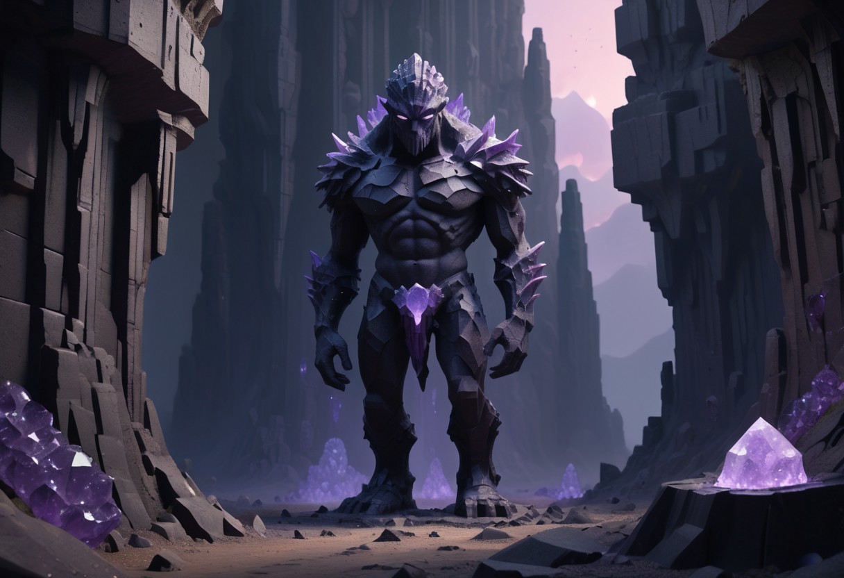 (fine texture, masterpiece, ultra-detailed, intricate, very awa, best quality, very aesthetic, absurdres, newest, volumetric lighting, scenery), voronoi, basalt columns, pixelized, voxels, BREAK geode colossus, mountain-sized golem made of amethyst shards rises from cracked earth. Its voxelized joints grind while crystalline birds flock around its glowing geode heart. basalt-column legs.