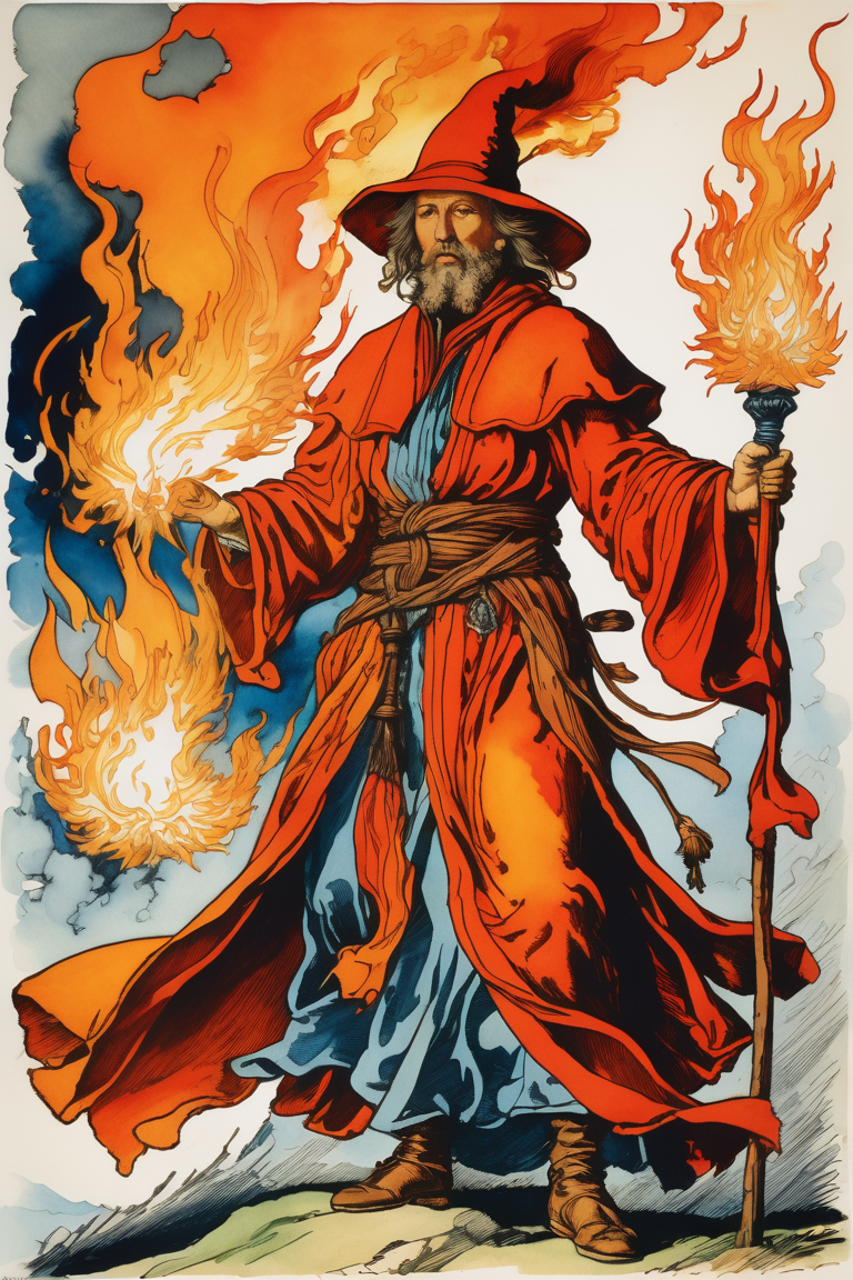 (intricate etched lineart) ,watercolor painting of ((A fiery mage adorned in flames-themed robes, wielding a staff ablaze with magical fire. The color palette showcases vibrant oranges, reds, and glowing ember accents, embodying a sense of infernal power and passion):1.3), quarter turn staging, (art by albrecht duerer:1.3) and (art by Heinrich Kley:1.3) and (art by charles Bargue:1.3)