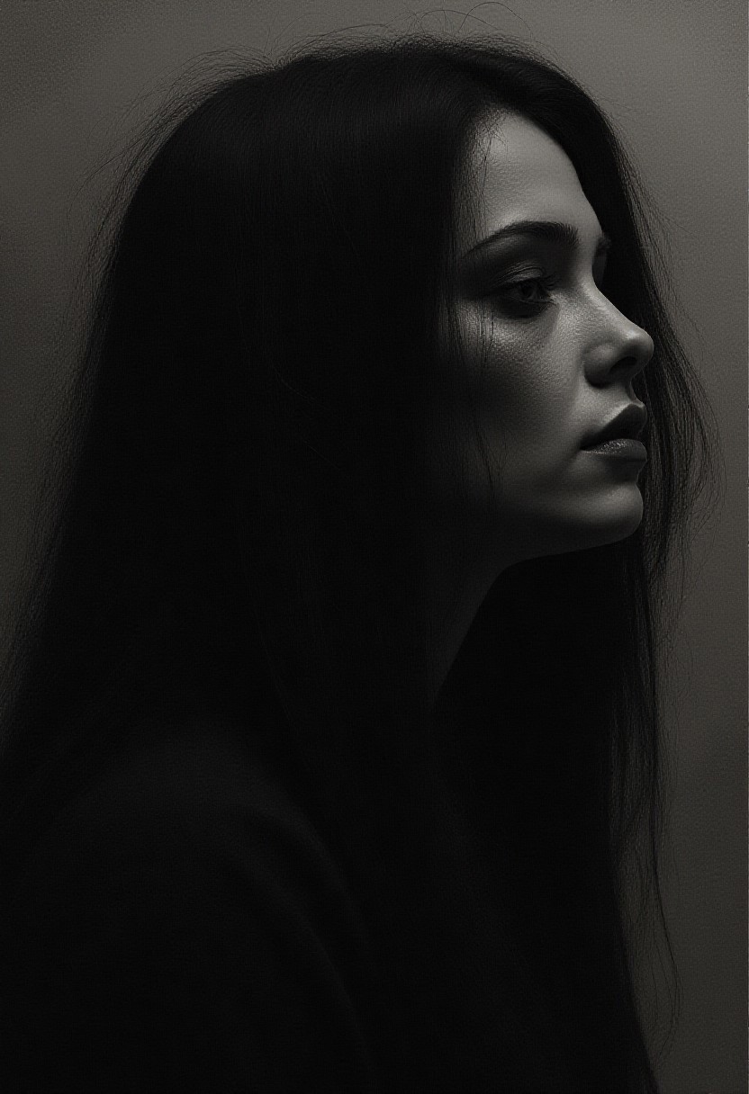 Surrealist art painting of a woman with long black hair, soft-focused realism --chaos 75 --ar 1:2 --profile 1kixoc4 --stylize 750 --v 7, <lora:- Flux1 - vanta_black_V2.0:1> . Dreamlike, mysterious, provocative, symbolic, intricate, detailed