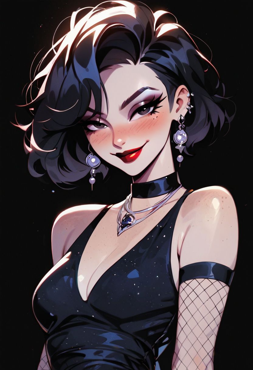 (score_9, score_8_up, score_8:1.2), ((solo)), beautiful mature mother, (pale white skin:1.2), freckles, blushing, (black short hair:1.2), black eyes, red lipstick, dark eyeliner, black necklace, large ring shaped black earing, smug smile, looking at viewer, small breasts, tight waist, slim feminine body, small hips, round ass, cute, eyelashes, fishnet stocking dress, black background, middle body focus, fully body shot