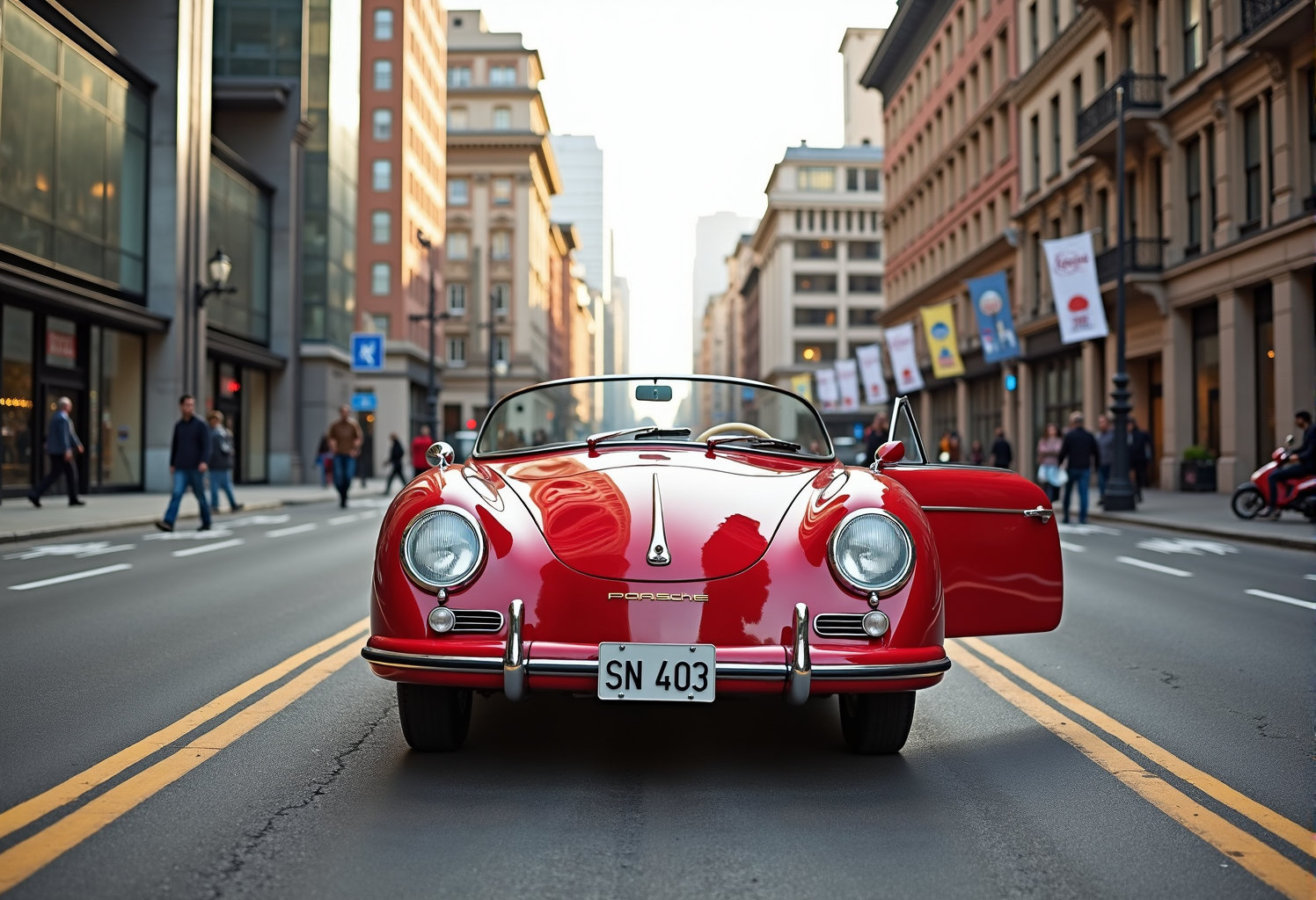 This photograph captures a classic, vintage red convertible sports car, specifically a 1963 Porsche 356, parked in the middle of a bustling city street. The car's glossy paint contrasts with the worn asphalt of the road, which is lined with double yellow lines and bordered by tall, multi-story buildings. The cityscape is a mix of modern and historic architecture, with tall glass and steel structures on the left and ornate, older buildings on the right. The car's front end, facing the camera, is detailed with chrome accents, including the bumper and headlight surrounds. The license plate reads "SN 403." The driver's side door is open, revealing a glimpse of the interior, which appears to be in good condition with a black dashboard and leather seats. The street is relatively quiet, with a few pedestrians walking on the sidewalks, and a few flags and signs visible in the background. The sky is clear, indicating a sunny day, with the light casting a warm, golden hue over the scene. The overall atmosphere is one of nostalgia and urban exploration, with the vintage car standing out against the modern city backdrop.