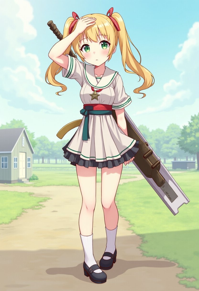 1girl, hand on own head, weapon on back, twintails, green eyes, standing, full body, looking at viewer, outdoors, 2d, anime