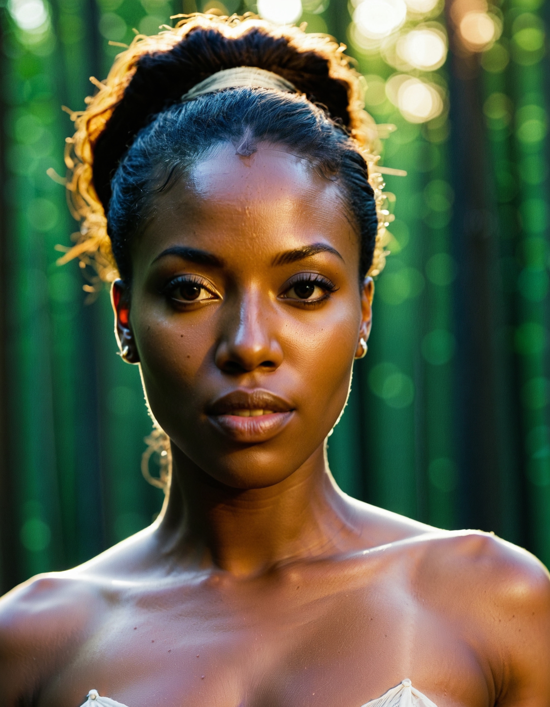 analogue portrait photo of a Beautiful dark skin African woman, clear focus, high resolution image, ,RandCloth__ <lora:Ayana_Lela_African_Woman:0.8> ,high quality, film grain, Fujifilm XT3, 8k uhd, dslr, film grain, kodak tri-x 400 film, grain photo DOF, faint lighting, dynamic angle, cinematic, Depth of field, bokeh, best quality, cinematic, light particles, highly_detailed, very_aesthetic, golden hour, beautiful_and_aesthetic ,Sexy pose, erotic pose, exhibitionism ,Forest cabin