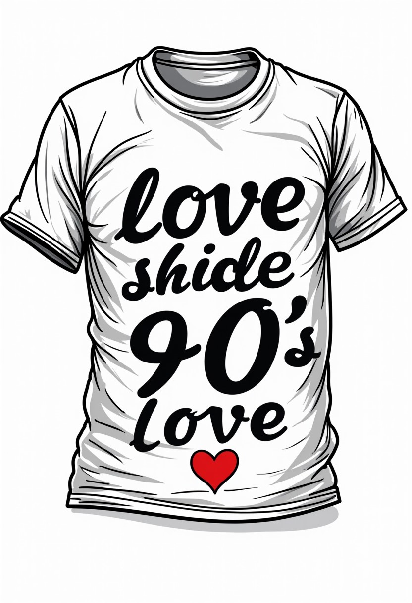 t-shirt design with a side view, using black ink on a white background. text logo 'love 90's' with a heart symbol. ((Pac-Man, floppy disks, cassette tapes )), and CDs. Include a 'Back to the Future' theme with the DeLorean car. (( the TV show 'Friends' )) text say ((90's love))