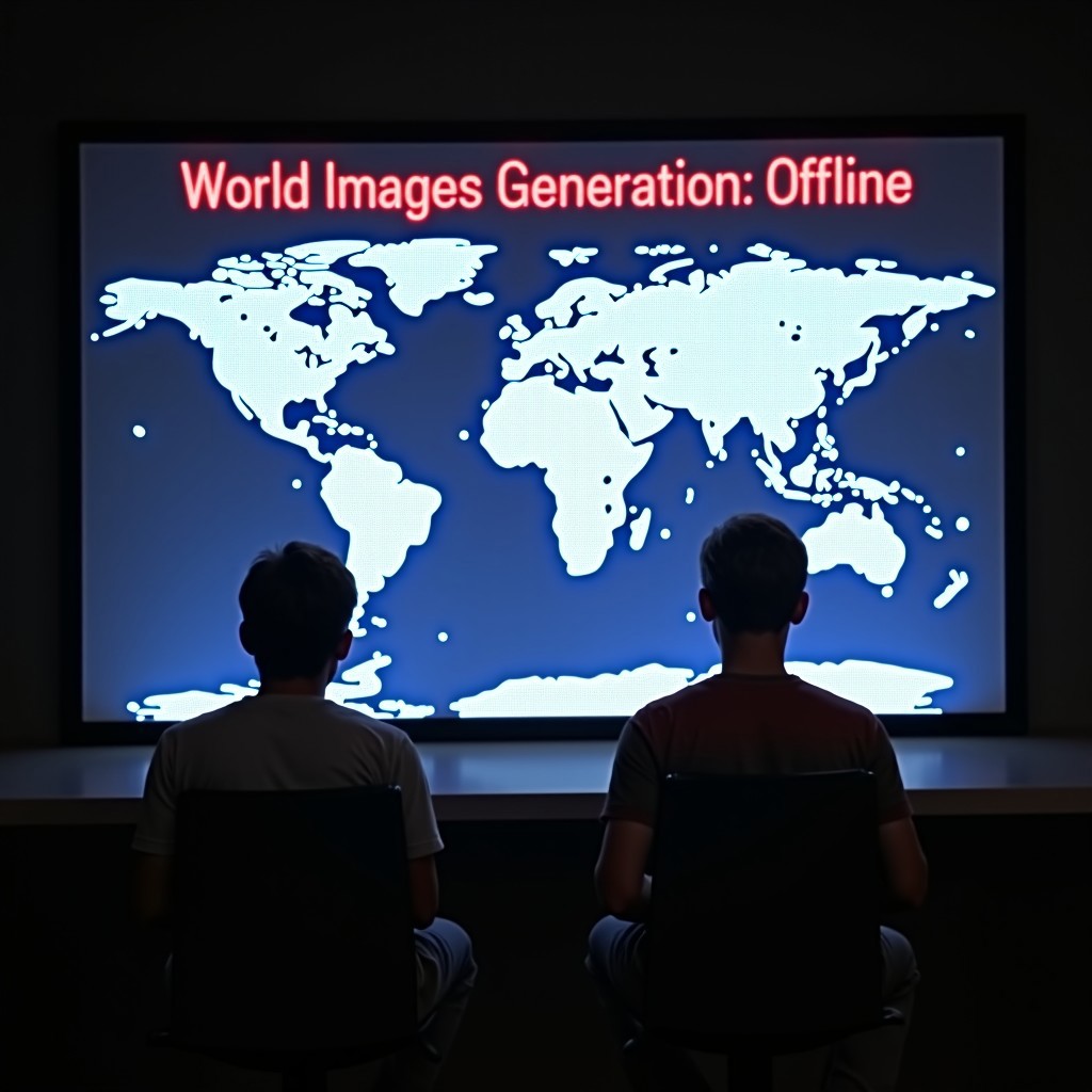 From the Wargames movie, there is a young man trying to verbally playing Tic Tac Toe in front of a giant screen. The room is a secret military base from the '80. The monitor has a giant wire-frame styled map of the world and a text: "World Images Generation: Offline". The word offline is written in bright red.