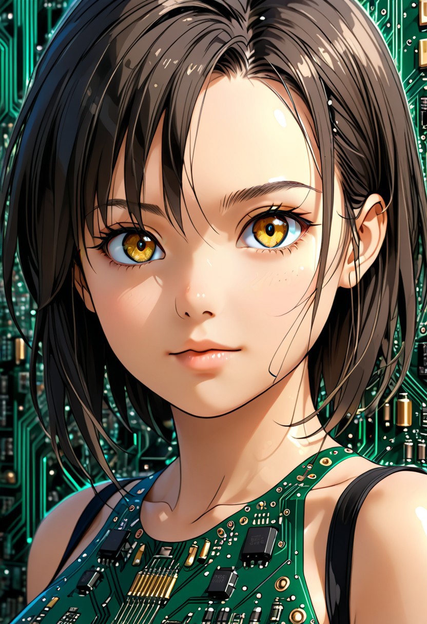 (masterpiece, 2.5D), (score_9, score_8_up, score_7_up,source_anime), (ultra-detailed,24K), best quality, CG, illustration, circuit board style, TzigoCBS, backlighting, close-up face focus, 1girl, ultra-detailed eyes, ultra-detailed background, YurYuna, stoic, upper body,