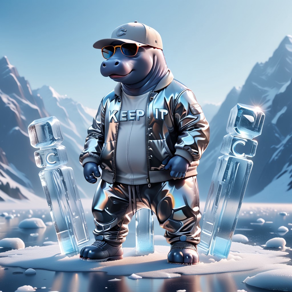 ((((("KEEP IT COOL!" text logo made of ice)))) <lora:dvr-ftl:0.8>, 1c3_w1n73r, magicNpolished, shiny, polished, reflection, glowing, light Anthropomorphic Hippo made of 1c3_w1n73r, wearing sunglasses, jacket, loose pants, baseball cap Standing on hind legs. Icy mountains background.