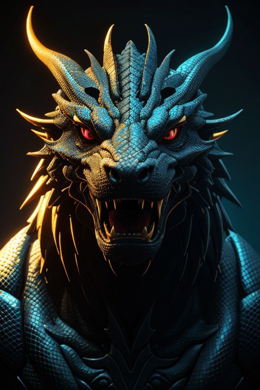 Asian dragon, gold blue snake gradient vibrant neon colour, rough, textural, broad brush strokes, red color prominent detailed, alienzkin, silhouette, spotlight, dark theme, c4d, blender, raytracing, unreal engine 5, render 3d, face close up,
