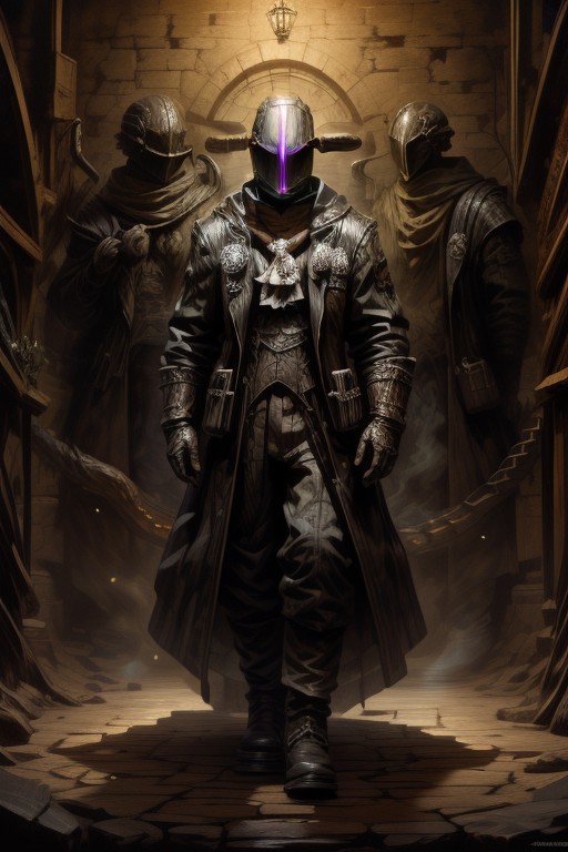 score_9, score_8_up, 8, score_7_up, solo, fantasy style, masterpiece, 8k, dynamic pose, 20 y.o, <lora:Fantasy_Classes_SD:1>, (Dungeons and Dragons) Thorough, analog style, eye focus, highest quality, (highly detailed skin), full body, photo of a exquisitely beautiful, BREAK artificer, bdsks, bfsks, Bondrewd is a tall man sporting mostly black clothing, with a long coat and a suit. He always covers his face with a black helmet which includes a gap in the middle where violet light shines through. His second body also has a lizard-like tail, which originates from the Artifact Third Works. His White Whistle is sculpted into the shape of two hands clasped together and is activated by rubbing instead of blowing into it, as it would be impractical to use while wearing his mask. sharp focus, dappled lighting, (backlighting:0.7), film grain, photographed on a Sony A7R IV, 18mm F/1.7 cine lens, (highly detailed, intricately detailed), 8k, HDR, seductively posing BREAK (EyesHD:1.2), (4k,8k,Ultra HD), masterpiece, best quality, ultra-detailed, very aesthetic, sharp focus, depth of field, ray tracing, best lighting, detailed illustration, detailed background, cinematic, BREAK detailed background, dynamic action image, BREAK oil painting, BadDream, negative_hand, NEG_EMBED_STABLE_YOGI_V3, FastNegativeV2, AissistV2 (detailed:1.3), (sharp focus:1.1), medieval style, (expressive face:1.2),,