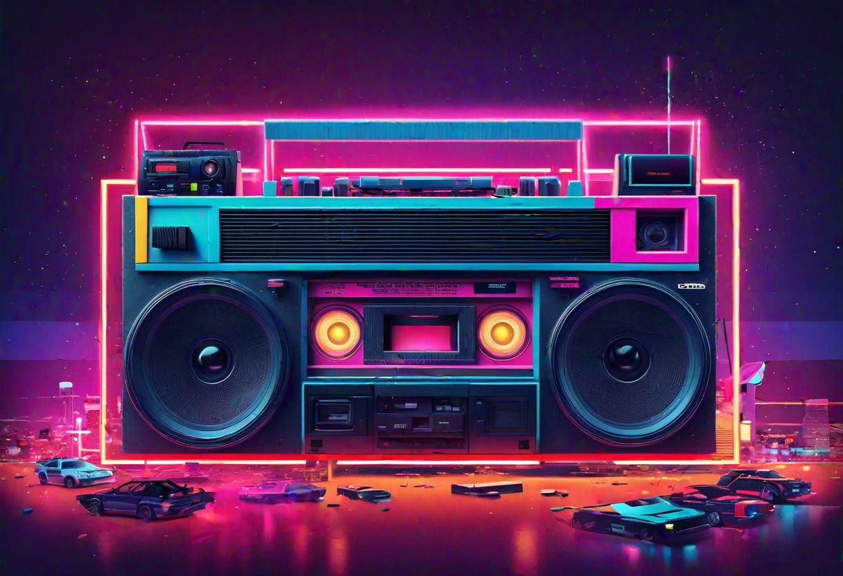 Create a vibrant digital art illustration that encapsulates the essence of the 1980s in a single image. Incorporate iconic elements such as cassette tapes, boomboxes, arcade games, neon lights, and retro fashion to evoke the nostalgic spirit of this era. The scene should exude an energetic and dynamic atmosphere, reminiscent of the vibrant cultural landscape of the 80s. Emphasize bold colors, geometric shapes, and a sense of optimism to capture the collective memories and experiences associated with this iconic decade.