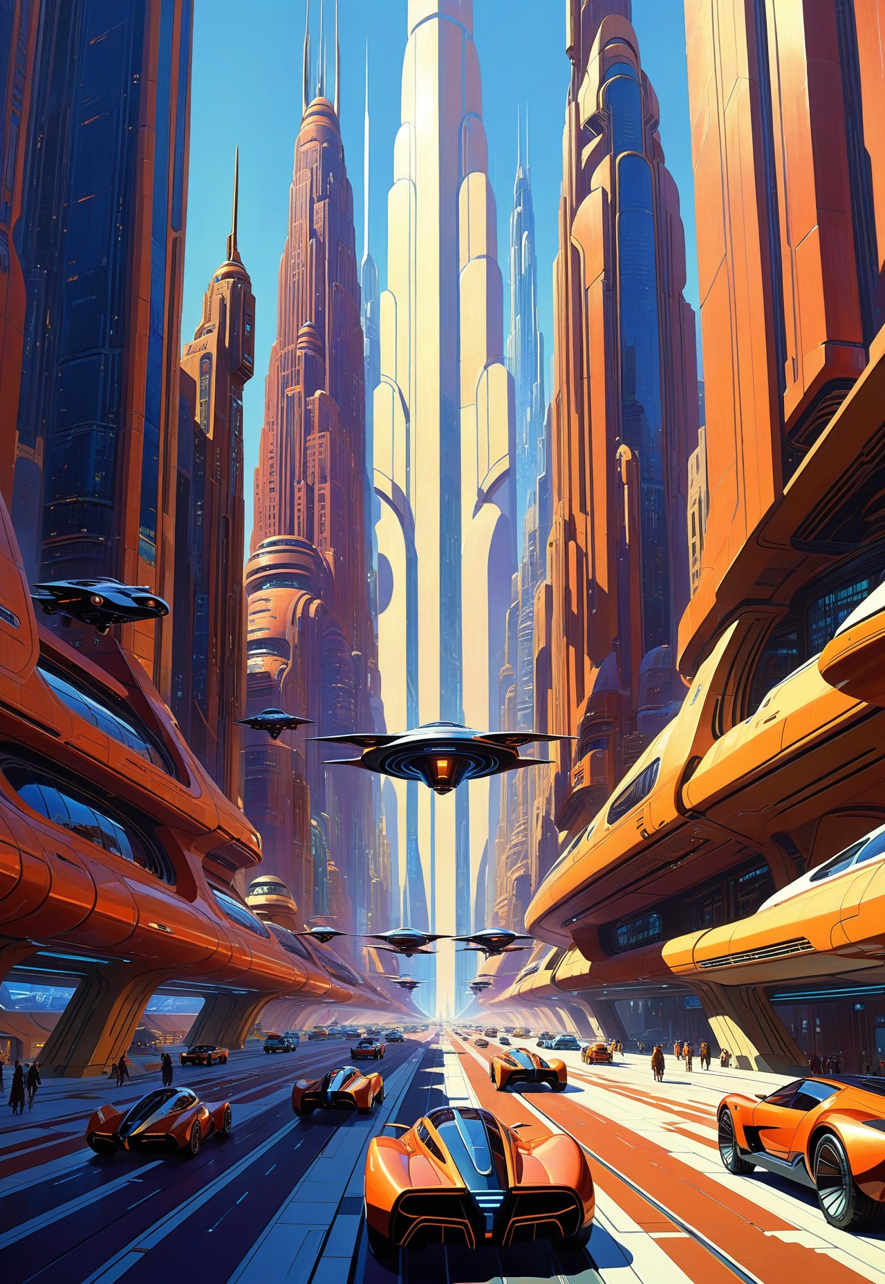 Impressionism, centered, Tiny brush strokes, A sprawling futuristic cityscape with sleek flying vehicles and towering art deco skyscrapers, Syd Mead style, the year is 2845, piece is rendered in 3D CGI, shadows, animated cell-shading, accurate, refined, defined, highly detailed, surrealism, follow negative prompts,