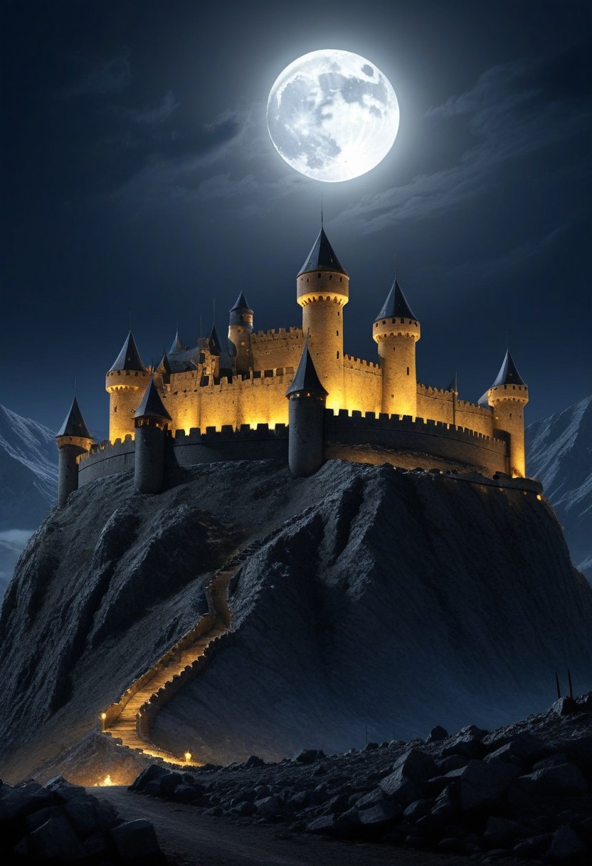 lazympos, fortress made of forged carbon,night, landscape, full moon
