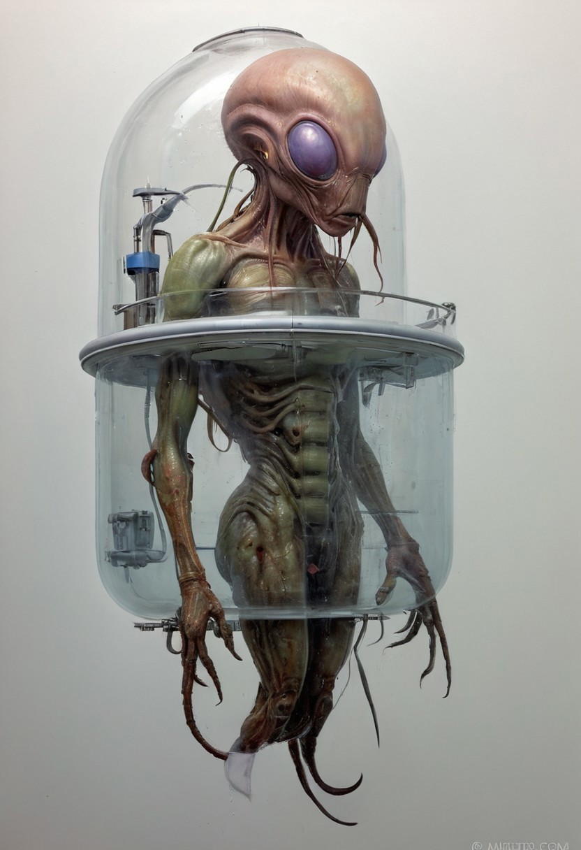 (Illustration by james gurney), an injured alien a biopunkai medical facility, alien, creature, science fiction, floating in a glass tank of water, science fiction, sd15_journalSketch, white background