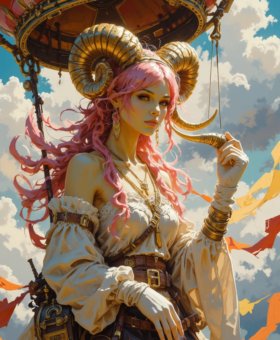 she has ethereal yellow skin that sparkles, her eyes are lavender, she has long pink hair, she is in an old- fashioned hot air balloon wearing old fashioned clothes, in her hand is a ram's horn, , v1v1d34m style