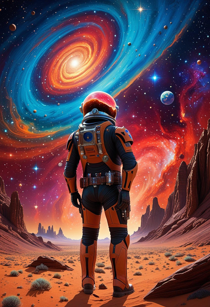 Surrealism, centered, Tiny brush strokes, A lone SpaceKnight floating serenely in the inky blackness of space, gazing back at a swirling, vibrant Earth. Stars twinkle like diamonds in the background, and a nebula paints the cosmos with ethereal colors. The spaceKnight's visor reflects the beauty of the universe. Created in a style that blends the vastness of space with the intimacy of a personal moment, reminiscent of the cosmic artwork of Barry Darwin, and the detailed space scenes of NASA, Sci-Fi, 3D, CGI, accurate, refined, defined, highly detailed, surrealism, red dead style, follow negative prompts,