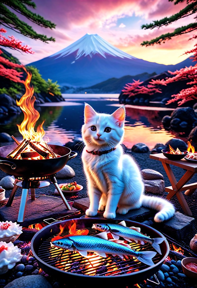 coralbugXL, kitten in beautiful campsite near mount fuji with beautiful lake, sitting next to campfire grilling fish, Food photography, Appetizing, professional, culinary, high-resolution, commercial, concept-art, digital, dreaminess, fantasy, other-worldliness, alien worlds, intricate details, highly detailed, ultra-detailed, absurdres, unreal engine, octane rendering, high contrast, vivid, vibrant, volumetric lighting, sharp focus, aid291, midjourneyv6.1,