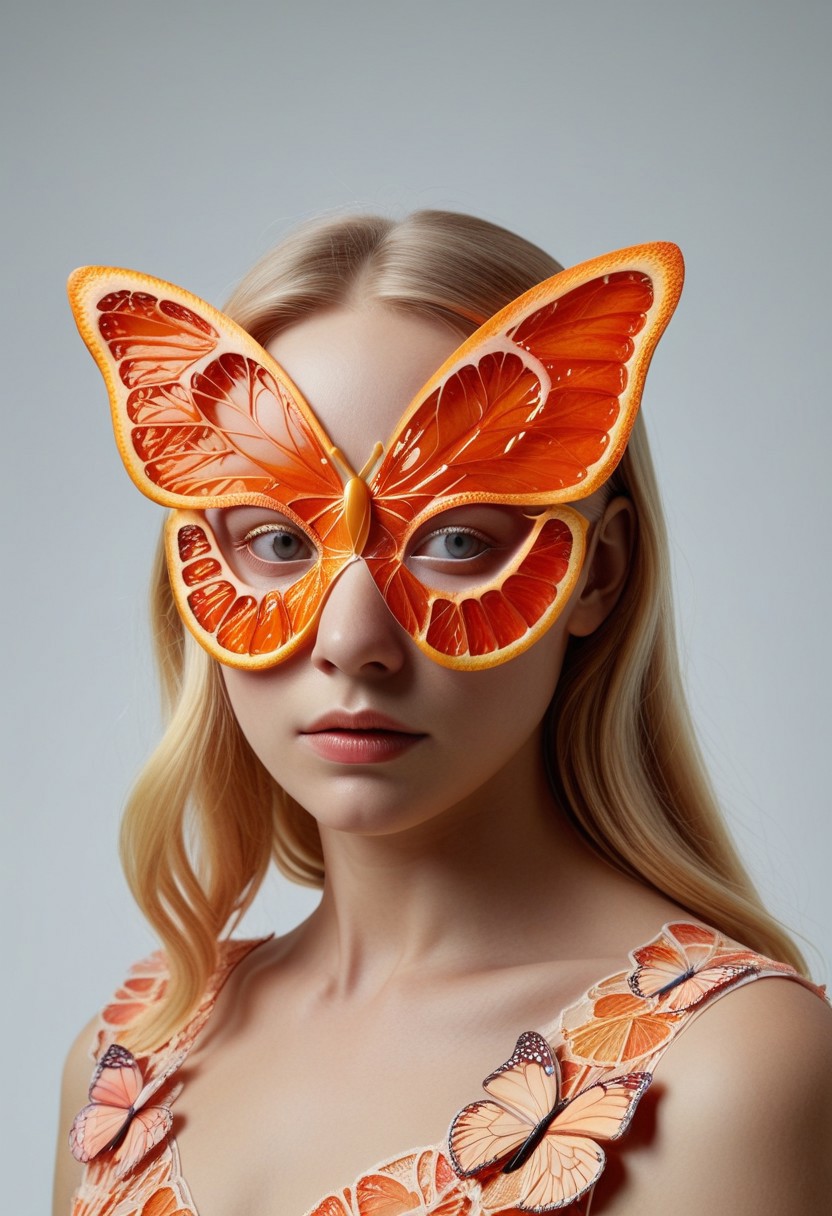 8k, Raw digital photo, portrait of a woman wearing a delicate butterfly-shaped blood orange mask, expressionless face, blonde hair, wearing a Elegant dress, soft lighting, simple background, butterfly wings subtly integrated into the mask, focus on face, Full Colour, 80mm, minimalist,