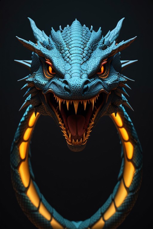 Asian dragon, gold blue snake gradient vibrant neon colour, rough, textural, broad brush strokes, red color prominent detailed, alienzkin, silhouette, spotlight, dark theme, c4d, blender, raytracing, unreal engine 5, render 3d, face close up,