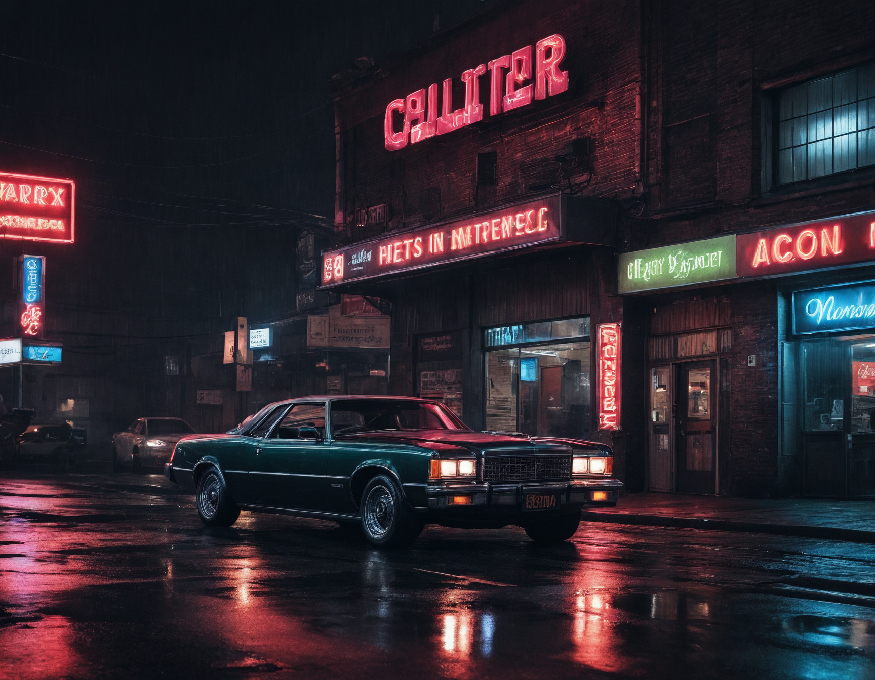 Neon noir <lora:AB ILL Vehicle:1>,Andrew Bell,car,classic, . Cyberpunk, dark, rainy streets, neon signs, high contrast, low light, vibrant, highly detailed