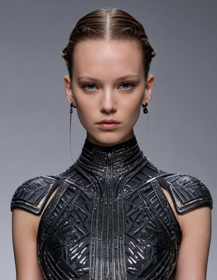 Techwear fashion <lora:Alexander McQueen-art deco-000005:1>,Alexander McQueen,art deco,dress,, hair, forehead, eyebrows, eyes, nose, lips, neck, collarbone, . Futuristic, cyberpunk, urban, tactical, sleek, dark, highly detailed