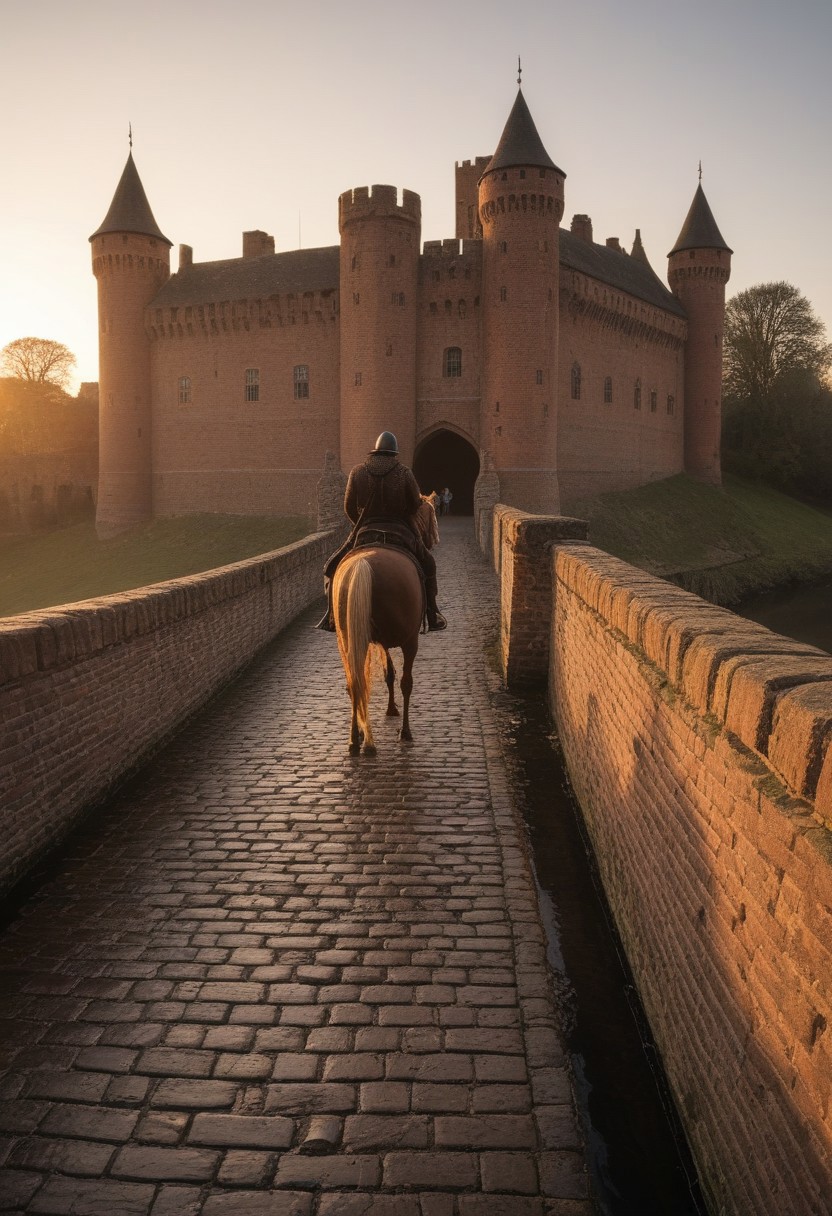 medieval brick castle viewed from a brick bridge at the base of the castle, horse with horseman, sunrise lighting