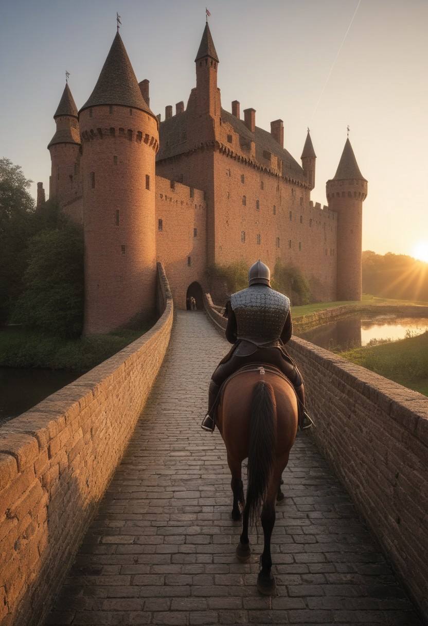 medieval brick castle viewed from a brick bridge at the base of the castle, horse with horseman, sunrise lighting