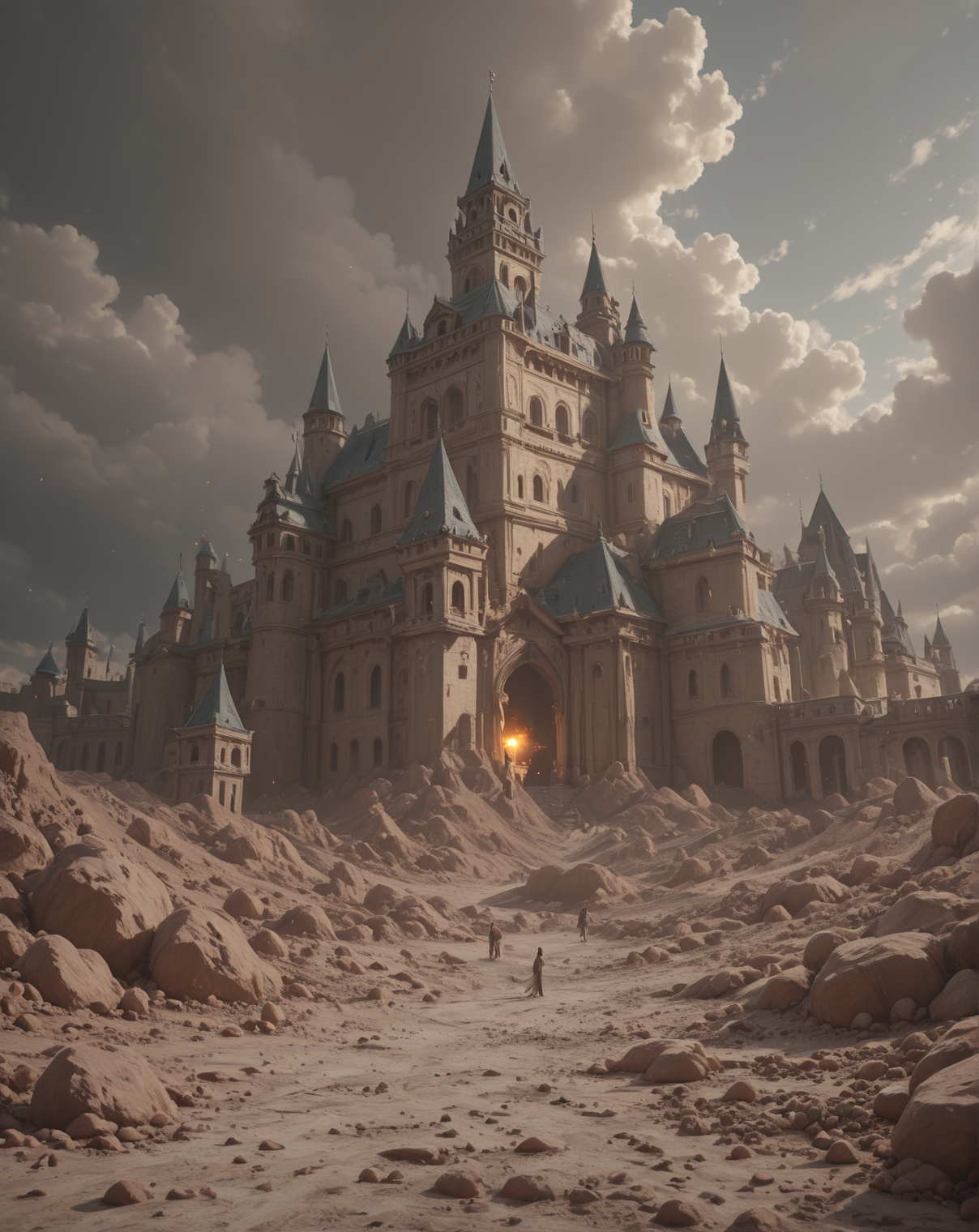 Massive white Castle of the King. Fields of flowers. Partially cloudy sky, dramatic clouds above, sunbeams shining through the clouds. Dreamy ultra wide shot, epic composition, atmospheric, hyper realistic, cinematic, ultra detailed, Photorealistic, Natural atmospheric lighting, intricate details, 35mm photograph, film, professional, 4k visuals, highly detailed, elegant, studio quality.