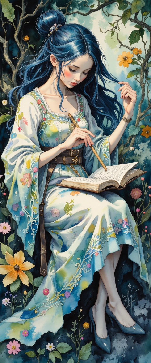 Rococo Style, lush natural settings, mythology, fantastical tableaus, light curved lines, pastel colors, ornamentation, exaggeration, playfulness, delicate brushstrokes, oil paints, her long dark blue hair is smooth, she keeps her hair loose except for a little of her hair which is pulled into a bun held up by what looks like a smooth stick, the stick is similar to a brown chopstick, her eyes are yellow, she wears fancy clothes of a medieval noble, she loves books, she loves reading books, she loves making books, she loves touching the pages of books, she is obsessed with books, Studio Ghibli Dark Fairytale, Oil painted