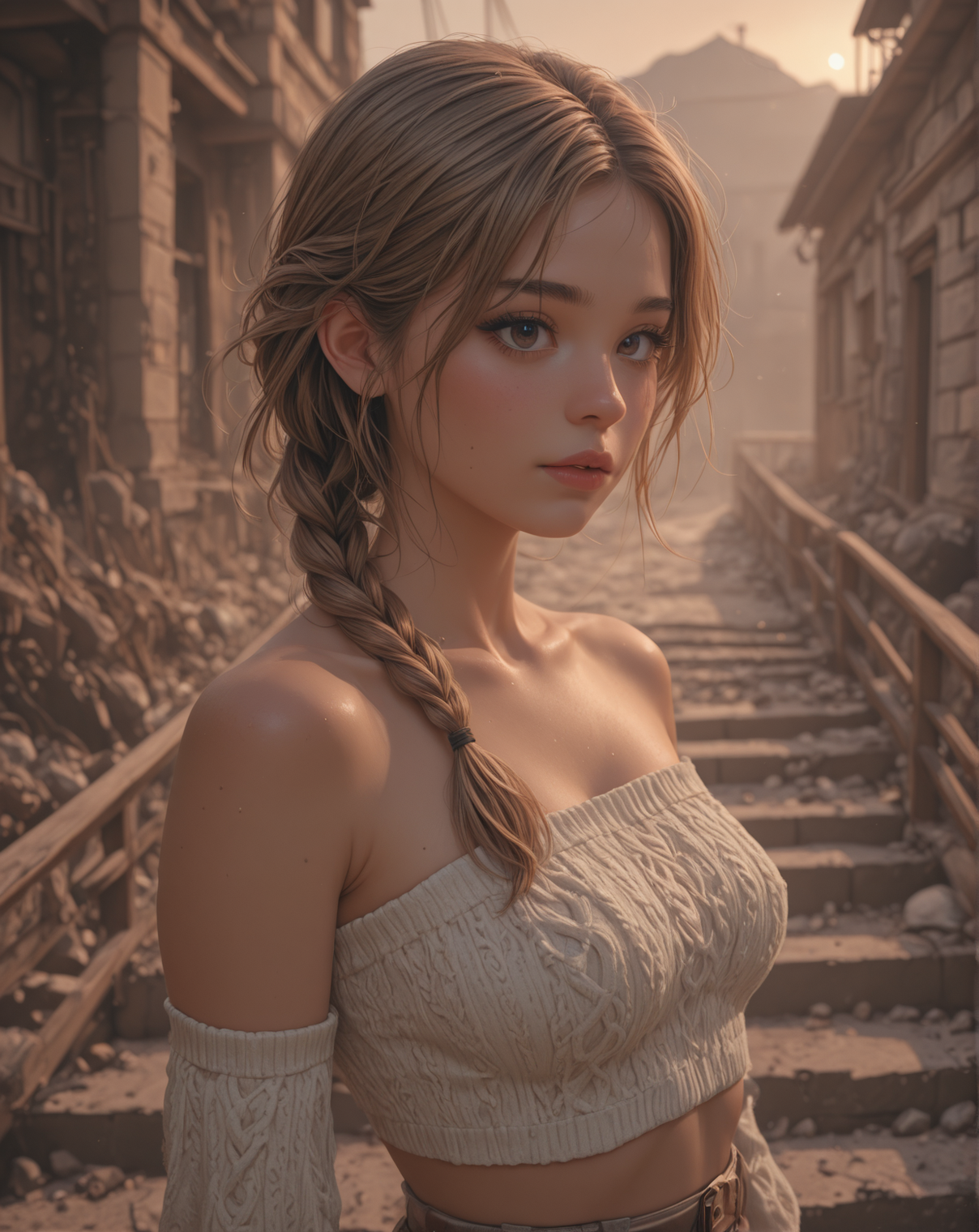 1Female. Cute wasteland scout, with dirty yet soft smooth skin. Sadness. Slight tan, sunburn. Loose Messy braided hair. She wears practical yet stylish clothing crafted from repurposed leather and salvaged metal, (Wearing Knit tube top:1.2). Highly detailed beautiful expressive eyes. Detailed face and hair. Studio quality dynamic lighting. Desolate landscape with an abundance of ruins and cracking ground. Heat haze subtly distorting the world around her. Harsh environment with a wide angle and a strong backlighting. Melancholic and hopeful. Collapsing bridge in the distance. Decay of the world. Photorealistic, Natural atmospheric lighting, intricate details, 35mm photograph, film, professional, 4k visuals, highly detailed, elegant, studio quality.