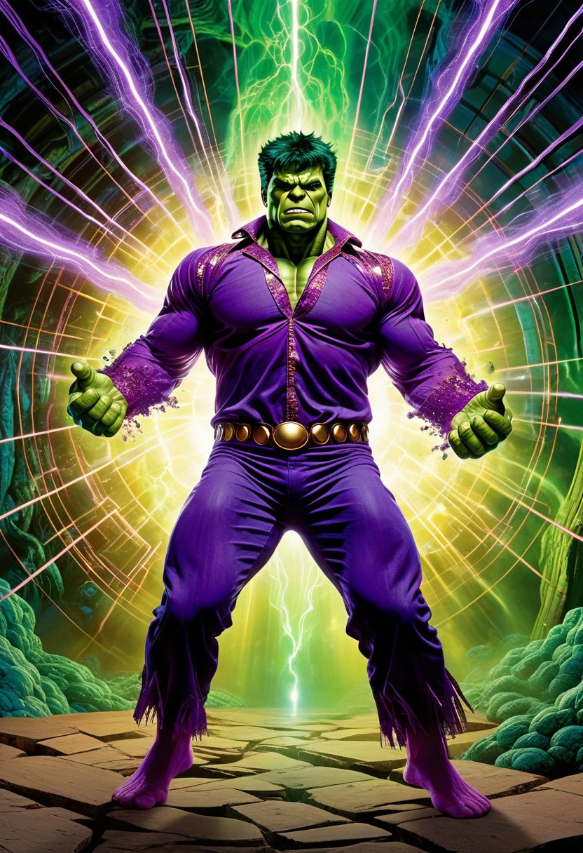 Surreal, Centered, The Incredible Hulk, Dressed In A ripped Purple Elvis Jumpsuit, levitating or centered in a mystical or ethereal environment, surrounded by multiple translucent, ectoplasmic afterimages with trailing energy wisps of subject rapidly splitting off and moving outward in various directions, creating a sense of motion, energy, and otherworldly power, The duplicates appear semi-transparent, glowing faintly, and fading into the background like echoes in time, purple and green energy resonance, complementary color harmony, Cinematic lighting, high detail, dynamic composition --chaos 7-12 --exp 5 --profile jack kirby--stylize 100-200 --style raw --weird 50