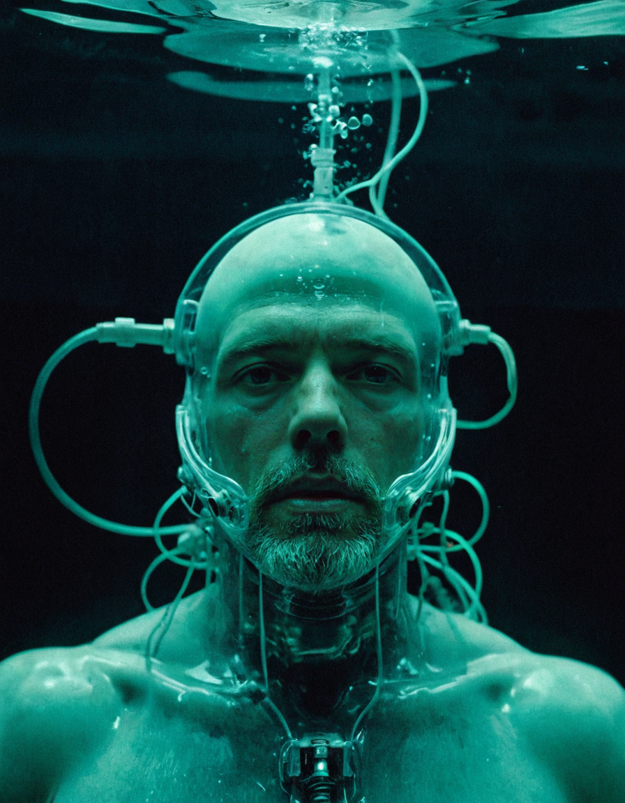 Surrealist art breathtaking cinematic film still ancient man submerged in saline pod within abyssal medical facility, suspended in translucent gel inside biomechanical exosuit, glowing aquamarine veins pulsing through flesh and wires, surgical machines resembling squids curled around body, dim cerulean lights pulsing across sterile titanium walls, bubbles rising slowly past pale wrinkled face, 1980s underwater lab aesthetic, dramatic top-down spotlight filtering through liquid medium, photographed on Kodak Ektar 100, Canon EOS-1V with 50mm f/1.2 lens, clinical isolation and forgotten immortality vibe,<lora:add-detail-xl:1>,OverallDetailXL,ArsMovieStill,<lora:MJ52_v2.0:0.7>,<lora:EldritchCandids1.1.2:0.75>,<lora:EpicF4nta5yXL:0.4> . shallow depth of field, vignette, highly detailed, high budget, bokeh, cinemascope, moody, epic, gorgeous, film grain, grainy . award-winning, professional, highly detailed . Dreamlike, mysterious, provocative, symbolic, intricate, detailed