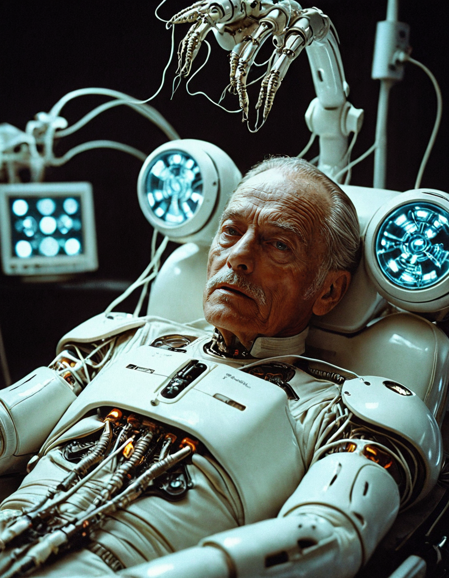 elderly man in a futuristic medical exosuit, lying on a surgical table, surrounded by thick, segmented robotic appendages, sterile white laboratory, cybernetic implants embedded in skin, wires and circuits trailing from body, ambient overhead LED panels, 1980s retrofuturism aesthetic, dramatic top-down lighting, ultra-high detail, photographed on Kodak Ektar 100 film, shot with a Canon EOS-1V and 50mm f/1.2 lens, cinematic composition, mood of clinical detachment and quiet decay,