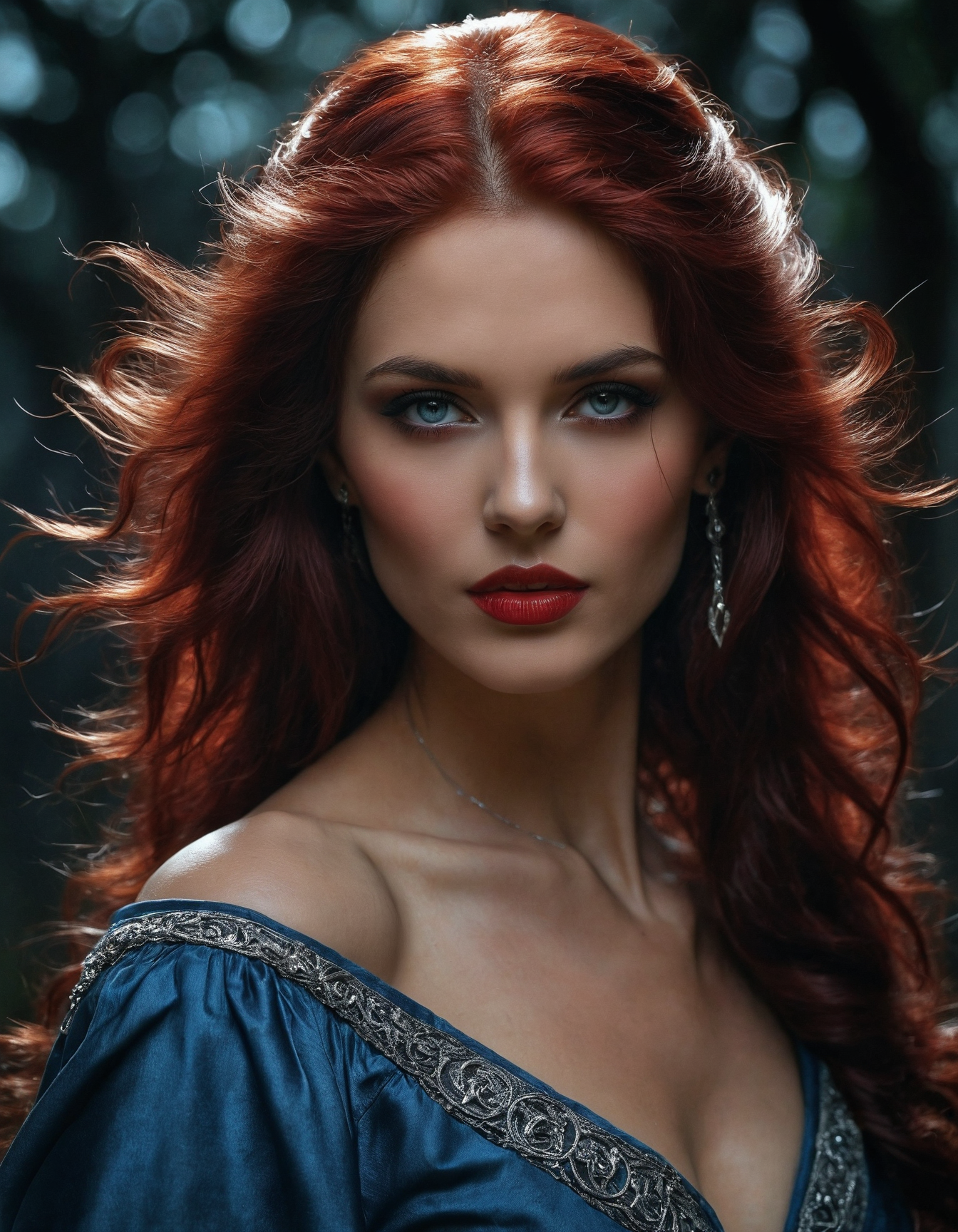 Renaissance style a woman with blue eyes and red lipstick is posing for a photo in the dark with her hair blowing in the wind [23],a digital painting,<lora:Anne Stokes CLIP2-000005:1>,Anne Stokes,epic fantasy character art, . Realistic, perspective, light and shadow, religious or mythological themes, highly detailed