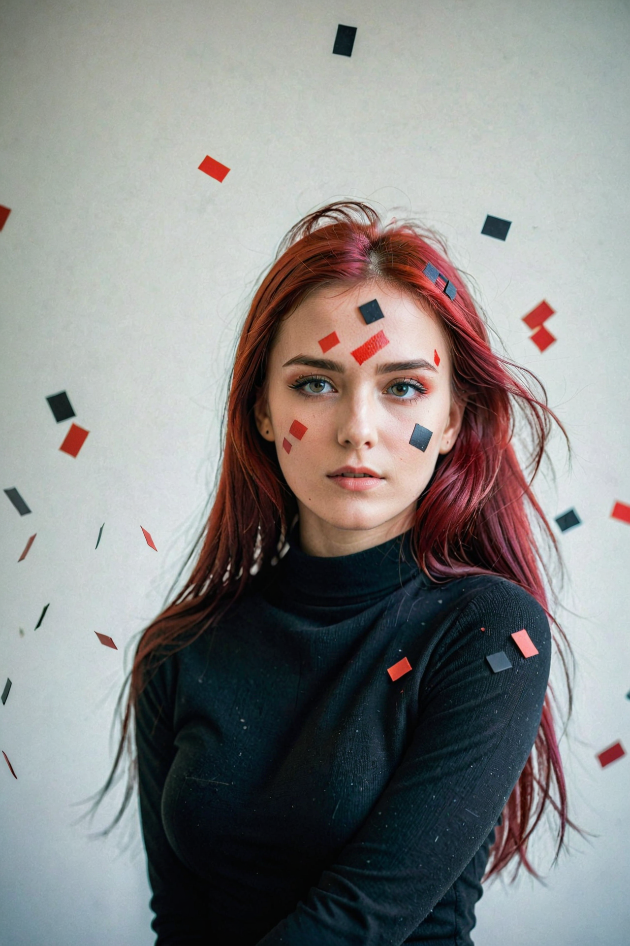 commercial photo on Sony 80mm f1.2, abstract portrait of 1girl, coloured hair, fragmented visual style,red and black color palette,evokes feelings of rebellion,passion,and freedom,blurred boundaries,high resolution,aesthetic, malevich style, suprematizm, unperfect skin, detailed skin with visible pores, bokeh, sharp focus on subject, film grain, masterpiece, HDR,Professional RAW photo <lora:Cinematic Hollywood Film:0.7> <lora:DetailedEyes_V3:1> <lora:InstantPhotoX3:1>