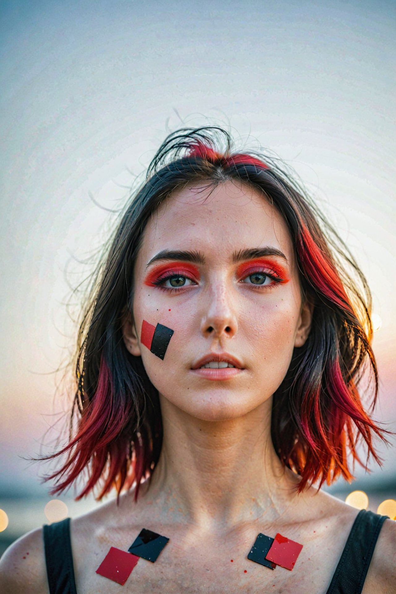 commercial photo on Sony 80mm f1.2, abstract portrait of 1girl, coloured hair, fragmented visual style,red and black color palette,evokes feelings of rebellion,passion,and freedom,blurred boundaries,high resolution,aesthetic, malevich style, suprematizm, unperfect skin, detailed skin with visible pores, bokeh, sharp focus on subject, film grain, masterpiece, HDR,Professional RAW photo <lora:Cinematic Hollywood Film:0.7> <lora:DetailedEyes_V3:1> <lora:InstantPhotoX3:1>