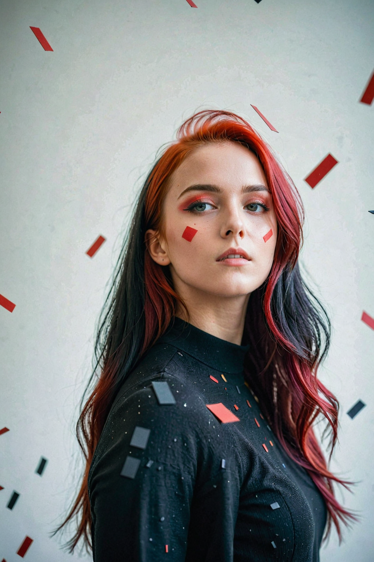 commercial photo on Sony 80mm f1.2, abstract portrait of 1girl, coloured hair, fragmented visual style,red and black color palette,evokes feelings of rebellion,passion,and freedom,blurred boundaries,high resolution,aesthetic, malevich style, suprematizm, unperfect skin, detailed skin with visible pores, bokeh, sharp focus on subject, film grain, masterpiece, HDR,Professional RAW photo <lora:Cinematic Hollywood Film:0.7> <lora:DetailedEyes_V3:1> <lora:InstantPhotoX3:1>