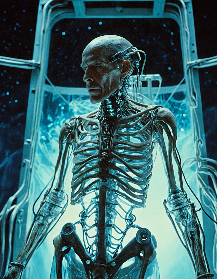 Surrealist art breathtaking cinematic film still close-up of aged manâs emaciated body wrapped in exoskeletal support frame, machinery fused into arms and spine, nutrient fluid cycling through transparent veins, tubes pumping oxygen into synthetic lungs, bio-monitoring HUD overlaid on visor, soft blue ambient light pulsing with his heartbeat, background shows the vast starfield through a cracked viewport,1980s retrofuturism aesthetic,dramatic top-down lighting,ultra-high detail,photographed on Kodak Ektar 100 film,shot with a Canon EOS-1V and 50mm f/1.2 lens,cinematic composition,mood of clinical detachment and quiet decay,<lora:add-detail-xl:1>,OverallDetailXL,ArsMovieStill,<lora:MJ52_v2.0:0.7>,<lora:EldritchCandids1.1.2:0.3>,<lora:EpicF4nta5yXL:0.4>,<lora:Year_3000_Movie_Stills:0.7> . shallow depth of field, vignette, highly detailed, high budget, bokeh, cinemascope, moody, epic, gorgeous, film grain, grainy . award-winning, professional, highly detailed . Dreamlike, mysterious, provocative, symbolic, intricate, detailed