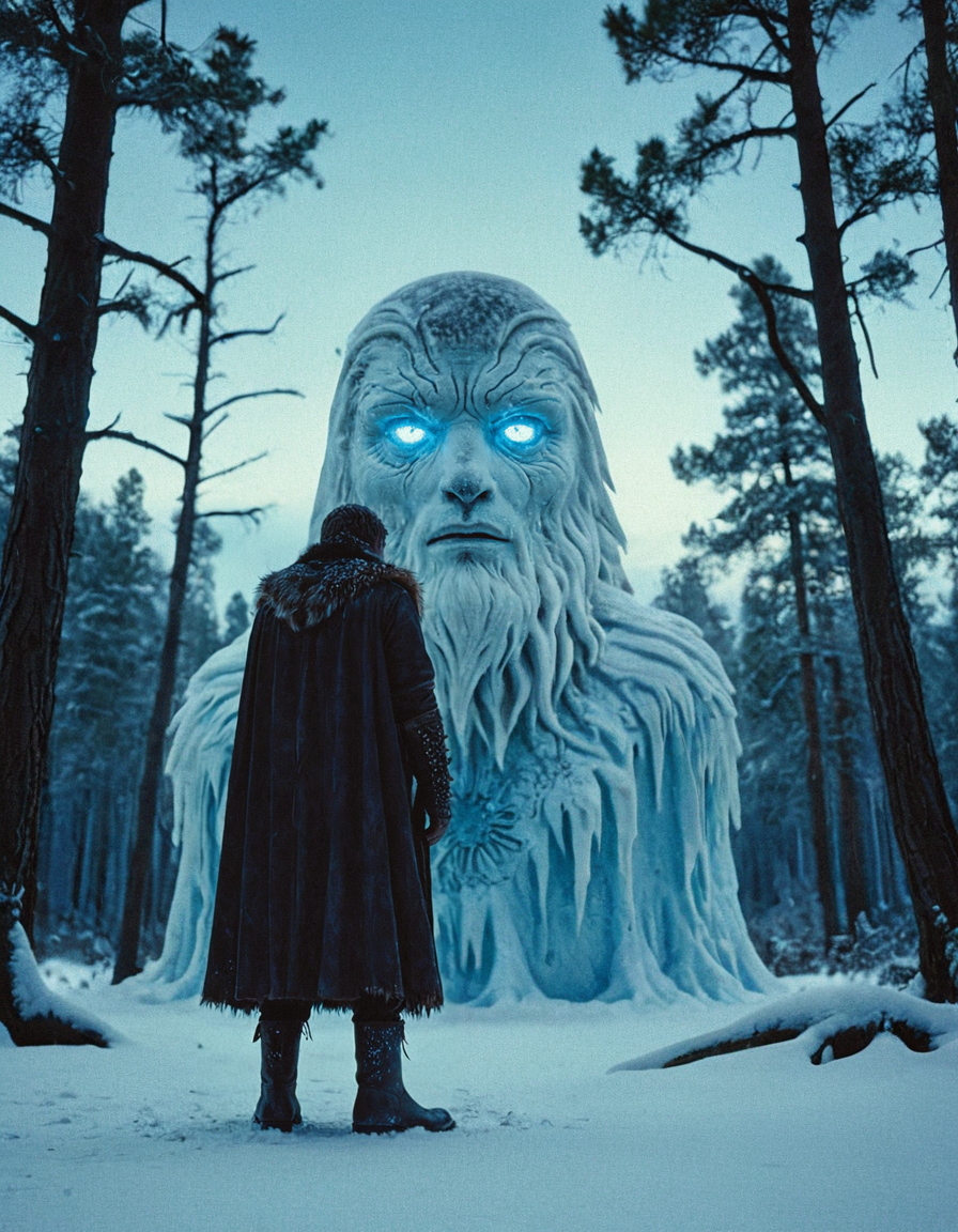cinematic photo Surrealist art breathtaking cinematic film still solitary cloaked wanderer in snow-crusted leather boots, standing at the edge of a frozen clearing, gazing up at a massive disembodied head floating silently above the forest, the head covered in matted white fur with glowing ancient eyes, snowfall drifting through moonlight, pines weighed with ice, ambient blue haze, shot wide-angle on Kodak Ektachrome 100, Nikon F3 with 24mm f/2.8 lens, tone of awe and cosmic stillness,<lora:add-detail-xl:1>,OverallDetailXL,ArsMovieStill,<lora:MJ52_v2.0:0.7>,<lora:EldritchCandids1.1.2:0.75>,<lora:EpicF4nta5yXL:0.4>,<lora:Year_3000_Movie_Stills:0.7> . shallow depth of field, vignette, highly detailed, high budget, bokeh, cinemascope, moody, epic, gorgeous, film grain, grainy . award-winning, professional, highly detailed . Dreamlike, mysterious, provocative, symbolic, intricate, detailed . 35mm photograph, film, bokeh, professional, 4k, highly detailed
