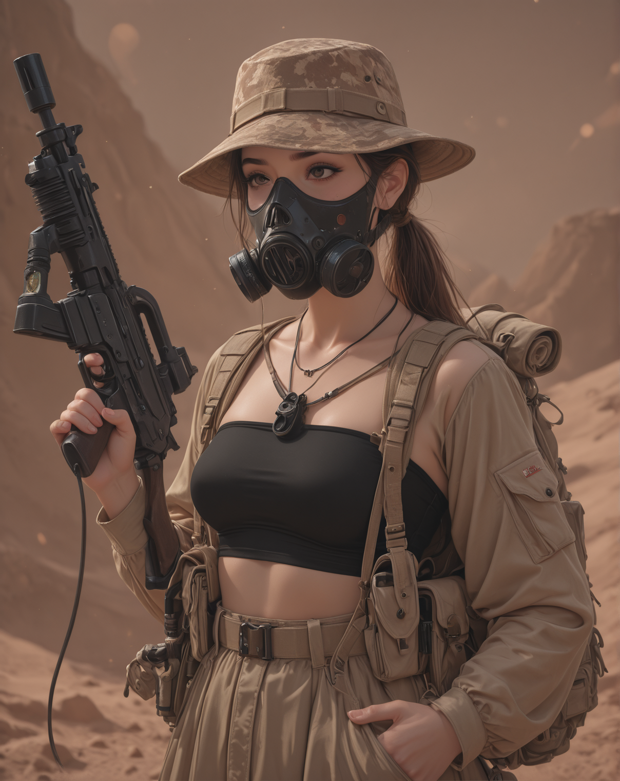 Upper body photo. 1girl walkng through the desert. (Wearing a black spandex tube top, long skirt with cargo pockets, military desert camoflauge boonie hat, and gas mask:1.2). Backpack straped to her back. Carrying a gun. Lots of straps and belts holding pistol, flashlight and canteen strapped to her body. Professional photo. Highly detailed beautiful expressive eyes. Detailed clean soft delicate face. Sunny Day. 35mm photograph, film, bokeh, professional, highly detailed dynamic lighting, photorealistic, 8k, raw, rich, intricate details, realistic, realism.