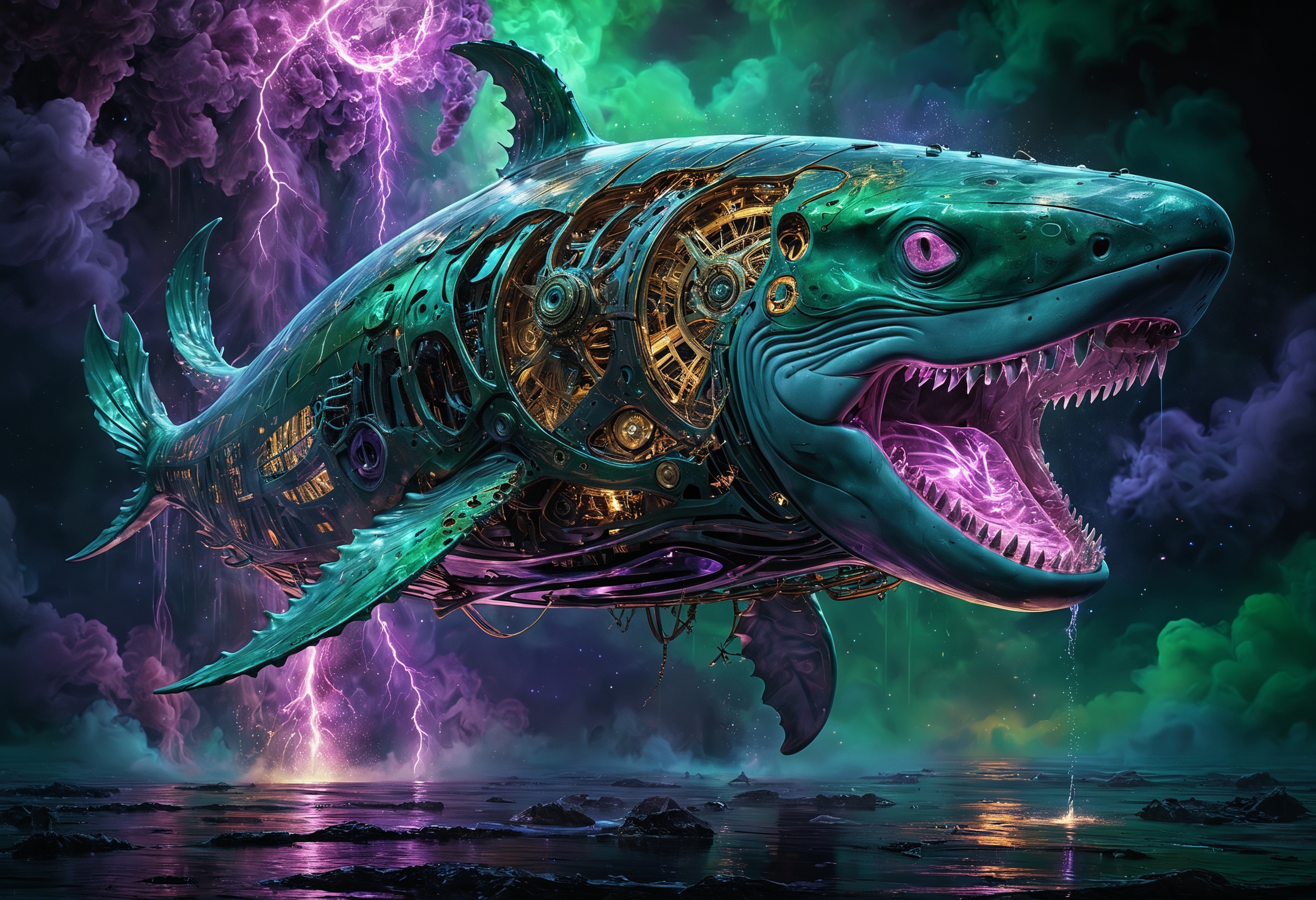 Ultra-detailed painting of a 'Clockwork Leviathan' — a colossal biomechanical whale floating in a neon-drenched void, its metallic ribs exposing gears that turn with liquid mercury. Thousands of tiny humanoid figures crawl inside its machinery, maintaining the illusion of life. The creature's eye is a shattered portal to a dying star, and its tail dissolves into fractal smoke. Style: hyper-realistic oil painting meets glitch art, with insane texture contrast (smooth chrome vs. cracked porcelain skin). Lighting: toxic green and deep violet, as if the scene is lit by a dying galaxy <lora:FluxDFaeTasticDetails:1> <lora:glowneon_xl_v1:1> glowneon, glowing, sparks, lightning