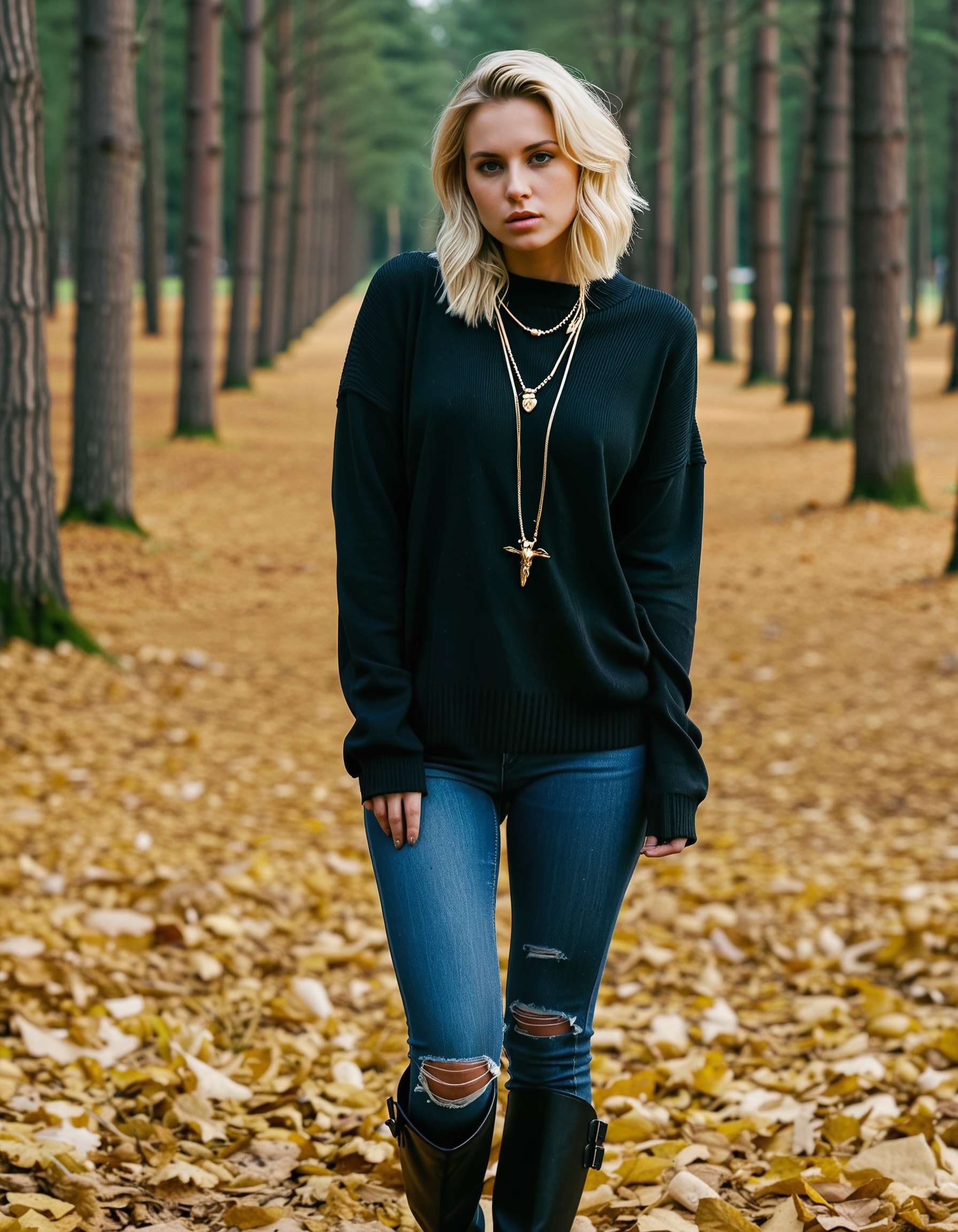 close up analogue photo of a beautiful 25 years old blond woman, clear focus, high resolution image, RAW full body analogue photo of a beautiful 25 years old woman, clear focus, high resolution image, ,wearing Dark aesthetic, a black oversized sweater with skull prints, skinny jeans, combat boots, and layered necklaces,,high quality, film grain, Fujifilm XT3, 8k uhd, dslr, film grain, kodak tri-x 400 film, grain photo DOF, faint lighting, dynamic angle, cinematic, Depth of field, bokeh, best quality, cinematic, light particles, highly_detailed, very_aesthetic, golden hour, beautiful_and_aesthetic ,Sexy pose, erotic pose, exhibitionism, ,A tranquil forest path with fallen leaves and chirping birds