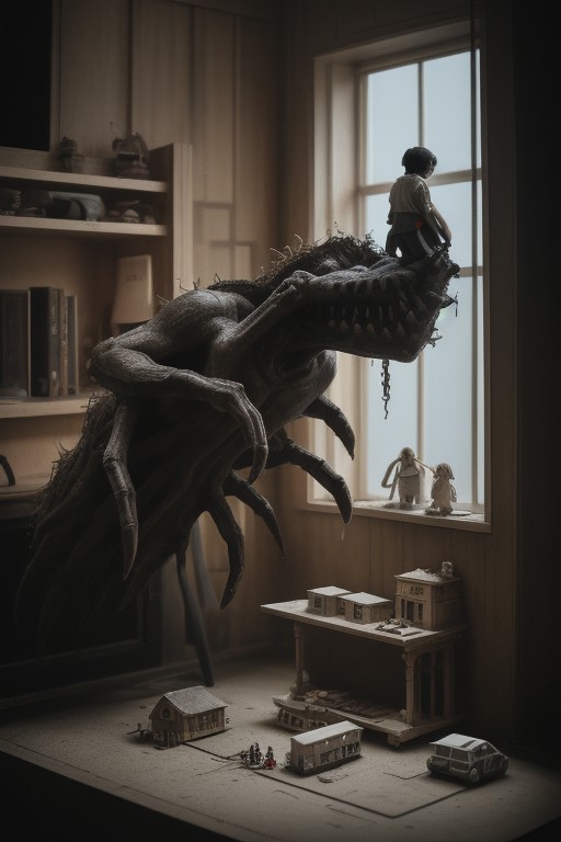 dark moody unsettling and surreal Kodachrome photograph, original character, hasselblad, indoors, giant horrifying demon hand reaching through doll house window, megalophobia, small world,