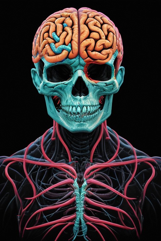A man drowning inside his own mind. FRONT VIEW. Subliminal messaging, Horror, neon-colored brain scan aesthetic on black background. the figure of a skull is seen inside the brain scan. Psychedelic brain scan. Horror, Vibrant, glowing neural pathways Abstract, futuristic aesthetic. Style mimics bioluminescence art. Sharp contrast between vivid colors and deep black background. realistic rendering of brain lobe. Conveys sense of brain death, cognitive decline, and mental degradation. Sharp jagged teeth. Horror theme.